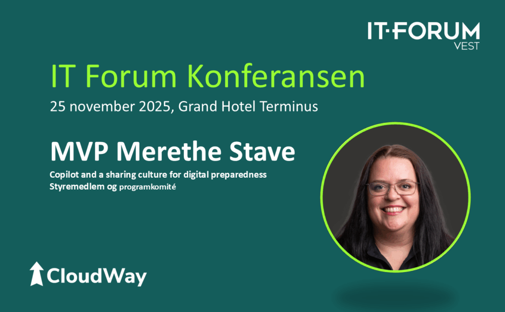 at Grand hotell TerminusNovember 25Join our MVP, Merethe Stave as she shares her thoughts about Copilot and a sharing culture for digital preparednes. She is also part of the board and ...